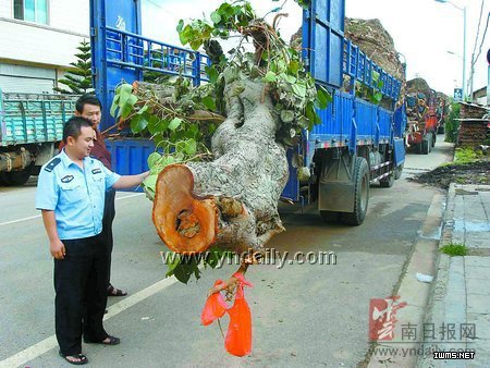 “把守各個道口,絕不讓偷樹賊溜走!”7月12日,經過約14個小時的守候,當地400余名群眾和兩家涉林單位在距施甸縣城約1公里處截住了裝滿了樹齡超過千年之上的4棵大葉榕和一棵香樟樹的4輛大型貨車。另外還有一棵直徑達1.7米的大葉榕被村民攔截在施甸至舊城公路28公里處。