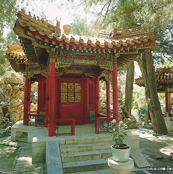 花園南部有一東西窄長(zhǎng)的矩形水池,當(dāng)中橫跨漢白玉石橋,橋上建亭一座,名曰臨溪亭,北與咸若館相對(duì)。亭的東西兩側(cè)原有翠芳亭、綠云亭,現(xiàn)為面闊5間的廡房各1座。花園的東南、西南兩隅原各有井亭1座,綠云亭內(nèi)流杯渠之水即從東南井內(nèi)引出。臨溪亭南花壇,高1m,6.5m見(jiàn)方,須彌座式,與北花壇相對(duì)稱(chēng)。再向南繞過(guò)太湖石疊山,即為花園的南入口。