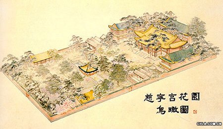 花園南北長(zhǎng)約130m,東西寬50m,總占地面積6800㎡。園中僅有建筑11座,占地不到總面積的五分之一,集中于花園北部,南部則地勢(shì)平坦開(kāi)闊,蒔花種樹(shù),疊石壘池,意在使太后、太妃嬪們不費(fèi)跋涉之勞而得山林之趣。