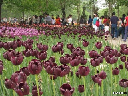 五一小黃金周的第一天,北京植物園共迎來了36985人到園內觀花,比去年同期增加了3000余人。園內世界名花展區(qū)、牡丹園、月季園音樂噴泉成為游客最為喜愛的景區(qū)。在世界名花展區(qū)雖然盛花期已過,但花期較晚的黑色郁金香花期正盛。在紅色、粉色、黃色郁金香的映襯下黑郁金香更顯得尊貴,眾多游客都在黑郁金香前攝影留念。