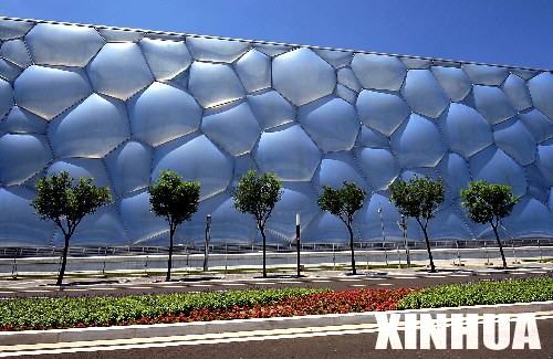 距離2008年奧運會開幕還有一個月時間,北京市正在對各個奧運會比賽場館的周邊環境進行最后的整治和美化。這是7月6日拍攝的在綠樹和花草襯映下的國家游泳中心(“水立方”)。 新華社記者王頌攝