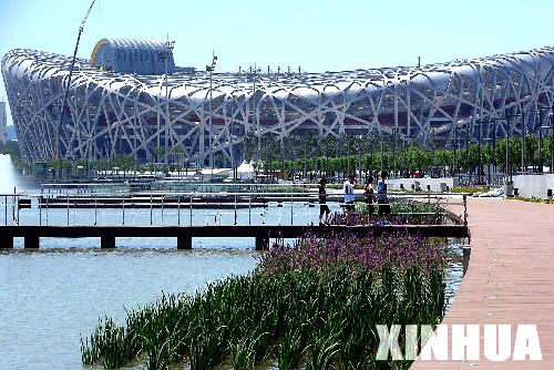 距離2008年奧運會開幕還有一個月時間,北京市正在對各個奧運會比賽場館的周邊環境進行最后的整治和美化。這是7月6日拍攝的國家體育場(“鳥巢”)附近的人工湖水草茂盛,景致誘人。 新華社記者王頌攝