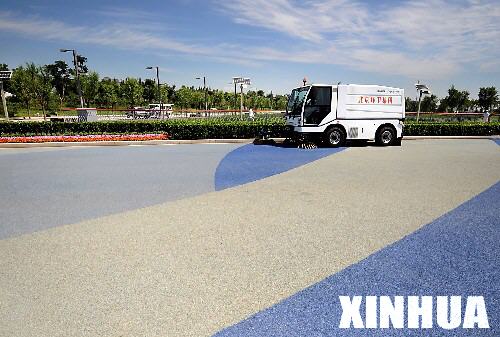 7月6日,清潔車正在清掃國家體育場(“鳥巢”)附近的彩色路面。距離2008年奧運會開幕還有一個月時間,北京市正在對各個奧運會比賽場館的周邊環境進行最后的整治和美化。 新華社記者王頌攝