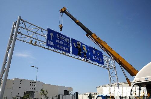 7月6日,工作人員正在更換國家體育場(“鳥巢”)附近一條道路上的指路標志。距離2008年奧運會開幕還有一個月時間,北京市正在對各個奧運會比賽場館的周邊環境進行最后的整治和美化。 新華社記者王頌攝