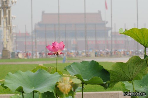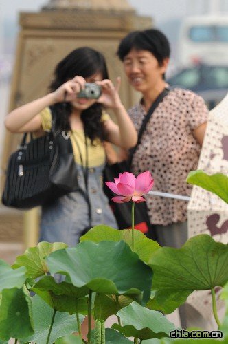 7月7日,北京天安門廣場上盛開的紅蓮引得游人拍照。北京奧運會進入倒計時一個月,天安門廣場上盛開的紅蓮吸引了許多游人駐足觀賞、拍照留念。新華社發(fā)(楊帆 攝)