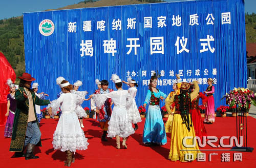新疆喀納斯國家地質公園揭碑開園現場歌舞表演 7月13日,新疆喀納斯國家地質公園揭碑開園儀式在被譽為“人間凈土”的喀納斯風景區舉行。 規劃面積達875平方公里的喀納斯國家地質公園位于新疆北部,屬新疆阿勒泰地區所轄,緊鄰中國與哈薩克、俄羅斯、蒙古的邊境。它是一個以第四紀冰川作用、地質構造作用、水動力作用和地質地貌景觀為主,以自然生態、人文景觀為輔,以高山冰湖、河灣灘流、森林草甸、草原民族文化相映成趣的綜合性地質公園。園區內生物資源種類豐富多樣,僅高等動植物就達1500多種,是一個世界少有的寒溫帶物種基因庫,具有很高的自然保護價值和科學研究價值。 新疆喀納斯國家地質公園2003年11月通過中國第三批國家地質公園評審,2004年被國土資源部正式批準為國家地質公園。