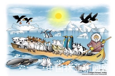 溫室效應令地球兩極的冰雪世界也不能幸免,冰山融化,北極熊與南極企鵝都沒有了立錐之地,一只小舟又能承載幾何?