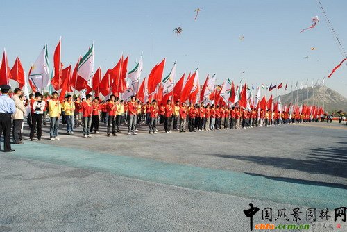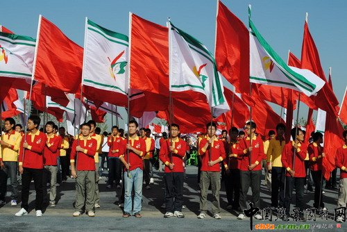 一千多名大學(xué)生旗手,迎風(fēng)舞動(dòng)手中的園博會(huì)旗幟
