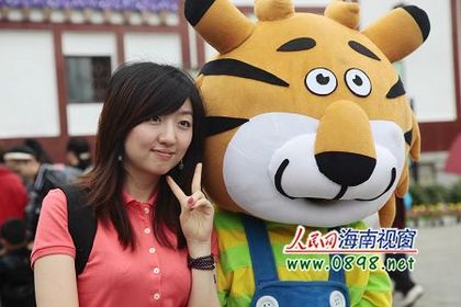 ![]() 春節假期,游人在南山景區與卡通虎互動拍照留念