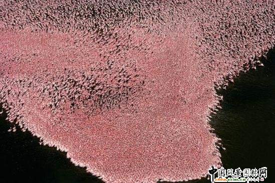 大紅鸛(Greaterflamingo)聚集在非洲肯尼亞納庫魯湖。盡管大紅鸛在納庫魯湖及其鄰近國家公園的數量估計達到140萬,但森林砍伐、污水、化肥殘余對這里的野生動植物構成了嚴重威脅。紅鸛喜歡在納庫魯湖的咸水區活動,因為這里也是甲殼類動物完美的棲息地。