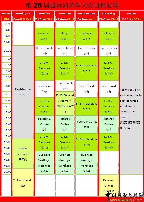 中國風景園林網訊 第28屆國際園藝學大會(the 28th International Horticultural Congress)將于2010年8月22-27日在葡萄牙首都里斯本(Lisboa)召開。會議由國際園藝學會(ISHS)主辦,每四年舉辦一次,是國際園藝學屆規模最大的學術盛會。 ![]() 本屆會議主題為"服務于人類的科學和園藝",強調園藝學的組成分為園藝學家、生產者、消費者以及社會,他們之間有著密切的關系。 大會地點設在里斯本市繁華區的葡萄牙里斯本會議中心(Lisboa Congress Centre),該處可以俯瞰塔霍河,距離里斯本國際機場20分鐘車程,距離城市的主要賓館10分鐘車程。另外,會議中心具有豪華的會議室和展廳,配備了最新的試聽設備,舒適的環境可以使得參會者有一個輕松的交流環境。 會議形式和內容豐富多彩,設有兩個專業展覽、18個報告會 和 14個研討會,參會者可以根據自己的研究方向和興趣選擇參加議題不同的報告會、專題討論會等,與風景園林相關的議題有兩個,一是觀賞植物論壇,二是園林和廣場論壇。 會后主辦方安排了多條線路的專業參觀和旅游,與會人員可以參加27日是為期一天的專業參觀,或27-29日進行為期3天的專業旅游,通過此次活動,可以領略葡萄牙和西班牙充滿創意和活力的園藝產業,在旅行中現場研討,增加知識。 會議于2009年11月開始注冊,目前,論文摘要提交時間(2010年1月30日)已經截止,組委會接收論文摘要時間為2010年3月30日,注冊費用優惠時間截止日為2010年4月30日,注冊時間截止日為2010年8月10日。 據悉,里斯本的八月非常安靜,氣候溫暖,適宜參觀旅游,可以體驗塔霍河沿岸的歷史遺跡和現代歐洲都市的寧靜氣氛。同時,科學充分的會議安排以及溫馨氣氛便于園藝同行之間的學術交流和建立良好互利關系,機會難得。 附1 會議日程安排 ![]()