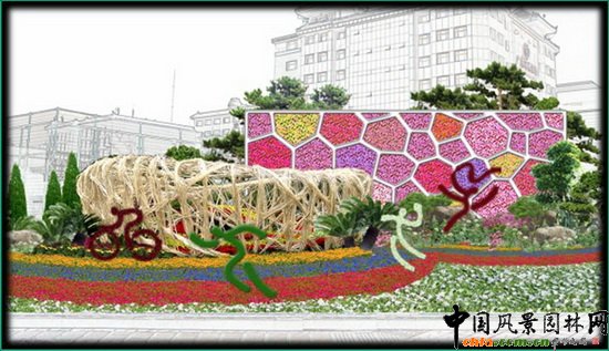 花壇主體水立方花墻長9.9米,寬0.6米,高4.5米;鳥巢長8米,寬6.4米,高1.8米;運動造型小人高2米。水立方花墻采用卡盆工藝,水泡分界線用硬質材料結合燈光;鳥巢造型采用鋼骨架結合三椏編制而成;運動造型小人采用五色插制。地擺花壇面積約90平方米,采用孔盤擺放,保證花材平整度。