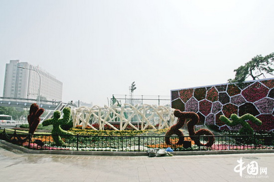 "奧運之光"花壇以花藝鳥巢及水立方花墻為主景,象征北京奧運精神在不斷地發展與延續。