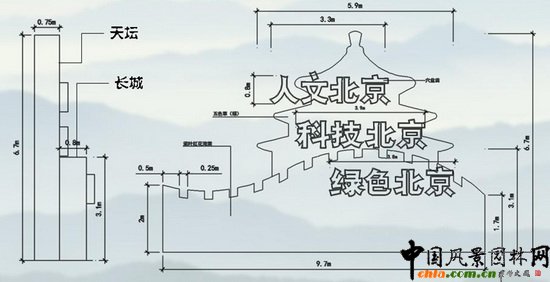 天壇造型頂高6.5米,長5.4米,寬0.75米,雙面五色插制;城墻長9.7米,頂高2.5米,卡盆工藝;三個北京字體采用穴盤苗工藝;各種公式和電子符號用硬質材料制作。地擺花壇面積約120平方米,采用孔盤擺放,保證花材平整度。