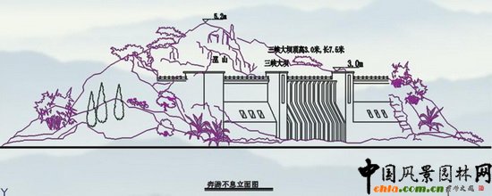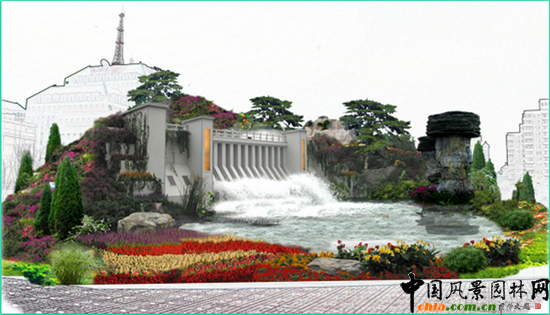 花壇主體三峽大壩頂高2.8米,長7米,寬1.2米。整體花壇植物布置采用自然的表達方式,植物方面以大型綠植為主景,大壩兩側及背面選用景石、綠植填充,選用高度、冠幅不一的彩、闊葉植物相互搭配加以點綴。大壩正面采用花卉色帶代替水面,做適當起伏,色彩選用簡潔明快的花材表示。