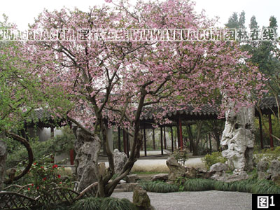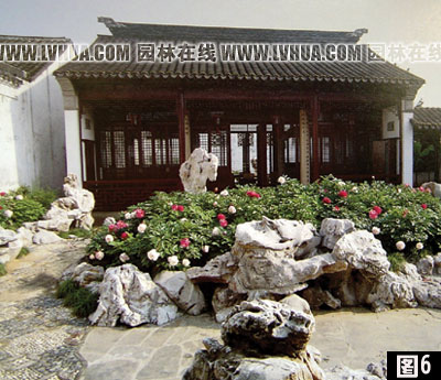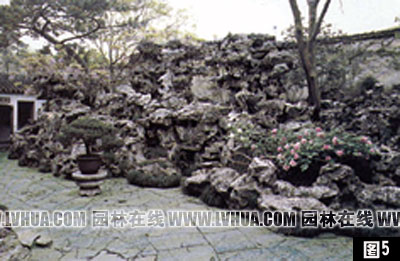 山石花臺 山石花臺在江南園林中運用甚廣,它也是古典園林中特有的一種花壇形式,多見于廳前屋后、軒旁廊側、或山腳池畔。由于江南一帶雨水較多,地下水位相對較高,而一些傳統名花如牡丹、芍藥等性喜高爽,要求排水良好的土壤條件,因此采用花臺的形式,可為這些觀賞植物的生長發育創造適宜的生態條件。同時山石花臺的形體可隨地應變,曲折自由,小可占角,大可成山,更能和壁山相結合,以形成層次(圖5),庭院因采用山石花臺形式而使其空間多變,地面鋪裝自然。園林中的花臺根據其空間布置形式可分為獨立式花臺、沿邊式花臺、角隅式花臺和多層式花臺等多種。