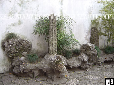 獨立式花臺:也稱中央圍圓式花臺,它一般位于庭院的中央,四周用自然山石疊置,其高度應根據其空間的大小而定,一般不超過70~80厘米,在疊置山石時應注意其輪廓的曲折、凹凸、進退變化及高低起伏(圖6)。 如蘇州留園的揖峰軒南的主庭中央花臺,周邊用太湖石錯落駁砌,中置一峰石,四周植以牡丹,花時芳姿麗質,超逸萬卉(圖7)。 沿邊式花臺:這是一種沿著園林中建筑物的邊墻而筑的山石花臺,其既可少占庭院的地面活動面積,又可借墻面的襯托,展示出一幅幅耐人玩味的樹石長卷(圖8)。沿邊式山石花臺的寬度常隨著空間的不同而不同,大多在1~2米左右,疊置時應注意其邊緣的蜿蜒曲折多變和高低起伏有狀,中間適當樹以突出的小峰石或石筍石等,所配置的花木,應選擇其姿態能與假山石的造型相協調,并注意其高低起伏和四季不同的觀賞品種。少數因空間逼仄,直接用山石緊帖墻面而筑,再在山石和墻體的空隙中填土,植以小竹或芭蕉之類的植物,如蘇州留園的揖峰軒后(圖9)。