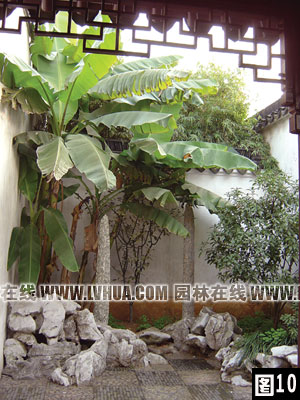 角隅式花臺:用自然山石依墻角而筑的角隅式假山花臺,能充分利用墻體的轉彎抹角,“化死角為神奇”,用自然山石進行疊置,恰似裸露的基巖,再在巖石所包圍的間隙處,進行填土,植樹栽草,叢蕉竹石,疏影搖墻,能韻人而免于俗(圖10)。多層式花臺:這是一種以小型花臺為原型的擴展,在疊置上采用覆土層疊的方法,以體現其層次變化和立體感,如怡園的鋤月軒南側的牡丹花臺,其依庭院的南墻而筑,自然地跌落成互不遮擋的三層花臺,兩旁則用太湖石踏跺抄手引上,可游可觀,花臺的平面布置委宛曲折,道口上石峰散立,錯落有致,正對鋤月軒的墻面上,按照壁山作法,疊置了作主景的假山峰石(圖11)。