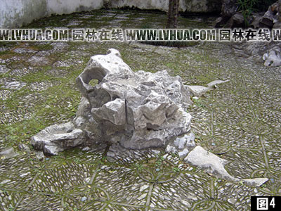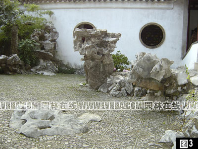 散置點綴 所謂的散置點綴就是集中一地,將多塊大小不同的山石,依照一定的地形或配景要求,攢三聚五、若斷若續地自然散放或點綴。在山石的具體布置上,根據其形態、面張,或平伏,或仄立,或疊砌,做到有聚有散、有斷有續、有高低、有曲折,既有層次,又要主次分明,在形式上雖為“散漫理之”,卻能顧盼呼應,神氣相聚。正如明代畫家龔賢在其《畫訣》中所說的那樣:“石必一叢數塊,大石間小石,然而聯絡。面宜一向,即不一向,亦宜大小顧盼。石小宜平,或在水中,或從土出,要有著落。”這種置石方式一般多用于土山、樹叢根際、園路或門景兩側等土方的點綴,如蘇州“耦園”園門的兩側,用幾塊太湖石進行有機的疊置,再配置黑松,從兩側來護衛園門,組成了引人入勝的門景(圖2)。而蘇州獅子林的立雪堂前庭園,則用山石組合成象形的“獅子靜觀牛吃蟹”(圖3)和貝氏家族的族徽三腳“金蟾”(圖4)等來點綴。