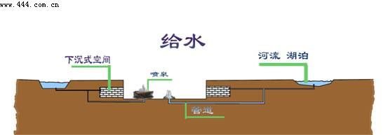 由于大多數河流、湖泊等淡水資源都在地面以上,所以這些水資源可以通過下沉式空間與地面河流、湖泊形成的為差自然的流入。這樣既省去了一些揚水設備,也大大節約了能源,達到了資源與經濟的雙贏。