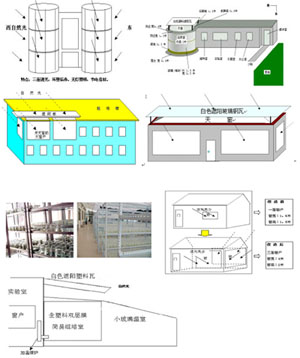 在材料的培養過程中,無論是誘導分化還是繼代培養,材料在初始培養階段主要是利用培養基中的營養物質來分化生長,只進行少量的光合作用,但是,隨著組培苗的長高對光照的需求也增加。常規培養要求日光燈輔助光強12—14小時,光強為800—3000lux(譚文澄,1991),這樣就需耗費大量的電能( 9.0元/1根燈管.月),這是一個造成成本過高的主要原因之一,而且在恒定的溫度、光強、無菌的條件下所培養組培苗對外界環境的適應力差。如果充分利用自然條件來設計培養室,將常規的恒溫輔助光強改為變動溫度及自然光照培養,溫度可通過空調來調溫,外加輔助如冬季加暖氣,夏季淋水亦可調溫,使溫度保持在18—28℃左右,光強可通過花玻璃,加遮陰網來調節,使光強在1000-3000lx內變化。1、自然光照培養室的建設 為了充分采光進行有效組織培養,對于新建組培室,濟南農業開發區采用了東南西三面采光方便的望遠鏡式雙園形設計,內徑6M,長31M、高度7M。外層建成雙層花玻璃封閉式結構,即能保證有充足的進光量,又能避免直射陽光的不均勻照射。內置培養架外圈排二列計18個,內層為一排計7個,基本達到每個培養架盡量爭取光源的原則。屋內上頂按裝日光燈以補充照明,所有物體均涂以白色材料,反光照明。其建筑見圖。其培養效果很好,由此培養的植物體分化正常,生長健壯。 后三個組培室的瓶苗培養室均采用平房式圓形建筑結構,以便在培養過程中,全天都可以采用自然光照,并且房子屋頂開大天窗,解決屋的內部和北部光太弱的問題。 2、簡易組培室的建設