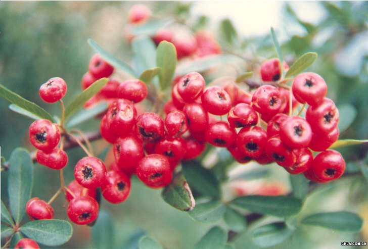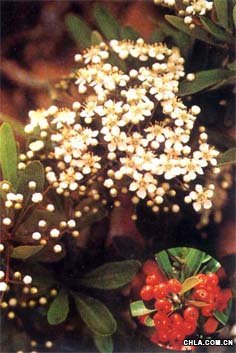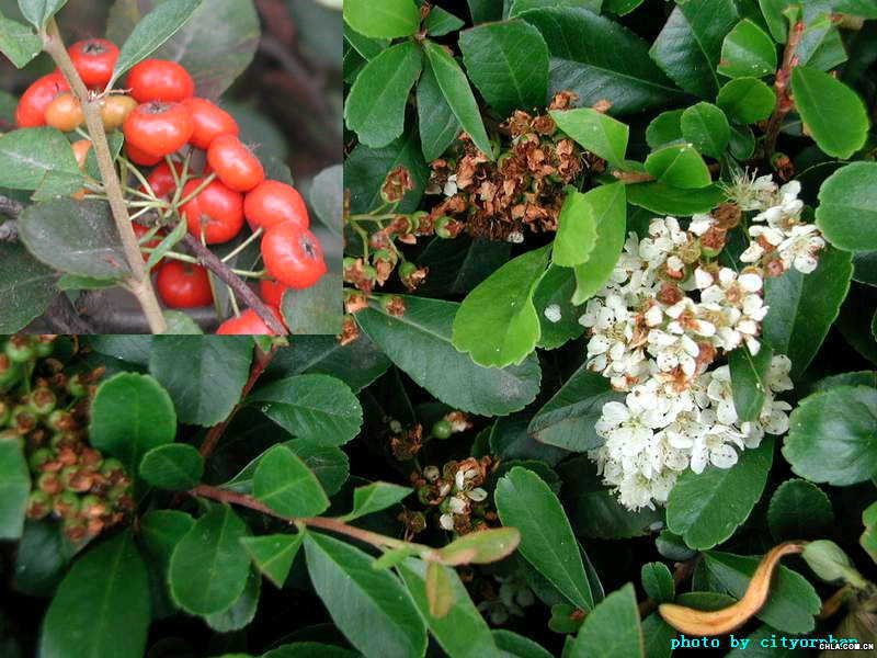 常綠灌, 高1至2米,枝有棘刺。單, 葉倒卵形或倒卵狀長圓形,先端鈍圓開微凹,邊緣有鈍鋸齒,綠色具光澤。復傘房花序密生在小枝上,五月份花開時節,全株雪白的小花十分醒目,到了10月份,果實成熟了,小球果橘紅至火紅色,密密叢叢,一團團一片片散布在綠葉叢中,經久不凋,顯得異常艷麗。