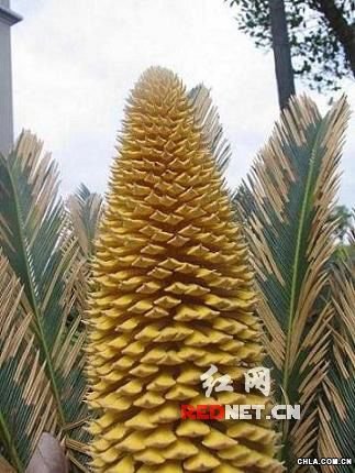 俗話說“鐵樹開花,啞巴說話”,意喻鐵樹開花之罕見。但在懷化洪江市人民檢察院庭院花壇中,移植僅兩年的兩棵鐵樹竟然同時開出形如寶塔、色為金黃的50多厘米高的花。