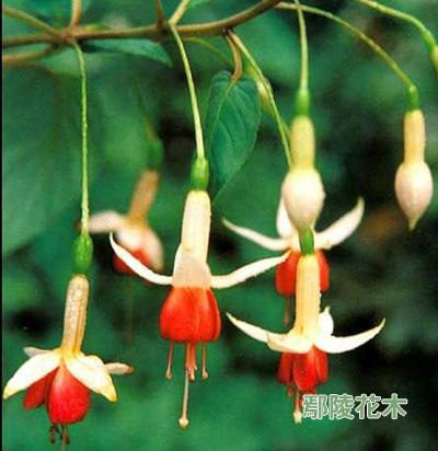 吊鐘海棠又名倒掛金鐘、燈籠海棠、吊鐘花,廣東又稱寶蓮燈。是柳菜科,倒掛金鐘屬的常綠灌。高可達(dá)1米。莖光滑,枝細(xì)而稍下垂,常帶紫紅色。葉對(duì)生或三葉輪生,具短柄,卵狀披針形;▎紊~腋,花梗長(zhǎng)約5厘米,下垂;萼筒長(zhǎng)圓形,萼片4裂,放射狀位于花冠下方,花冠倒掛,呈鐘鈴狀,并由此而得名。雄蕊,雌蕊高出花冠,如象燈籠的吊須。