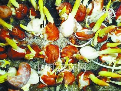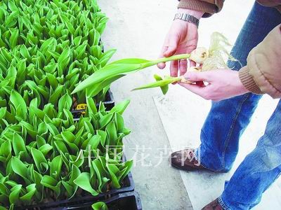 在荷蘭,從事大規模郁金香切花生產的種植者一直在尋求一種技術更可靠、更經濟的種植方法,以減輕生產風險,帶來更多的利益,所以他們開始研究切花水培生產技術。荷蘭政府在1988年頒布了一項關于植保的法案,加快了郁金香水培技術在荷蘭的應用。現在,荷蘭水培郁金香鮮切花生產技術已經非常成熟,生產的郁金香切花占總產量的五六成。 我國每年進口兩三千萬粒郁金香種球,其中約1500萬粒用于鮮切花生產。由于傳統的土栽方式存在缺陷,種植戶不一定能按照自己的計劃采收高品質的郁金香鮮切花,甚至種植失敗。鑒于此,筆者所在公司自2006年開始與荷蘭 JANDEWIT&ZN.BV公司、荷蘭PROEFTUINZWAAGDIJK研究所一起,在浙江進行水培郁金香鮮切花生產技術試驗。下面是5℃郁金香種球切花水培生產技術要點。 一、種球質量 盡可能選擇外皮光滑、無損傷、無青霉菌感染的種球。青霉菌會造成根系發黃、植株變矮、重量減輕,切花品質變差。 二、品種選擇 我國市場流行的諸如‘中肯’(AdRem)、‘法國之光’(IledeFrance)、‘琳馬克’(Leenv/dMark)、‘人見人愛’(World’sFavourite)、‘金阿帕爾頓’(GoldenApeldoorn)等品種,都適用于水培生產。 三、種球處理 1.去皮:收獲較早的種球生根相對較難,水培時可能種球開裂,不會開花,特別是‘中肯’、‘法國之光’、‘白夢’和‘橫濱’這些品種。為了避免上述問題,種球在種植前應先去皮。 2.規格:達爾文雜交型等莖稈長的品種應使用大規格的種球種植,如周徑12厘米以上的。 四、種球消毒 對種球進行消毒處理可以減少青霉菌的發生幾率。用75%多菌靈粉劑配制成800倍液,浸泡種球20分鐘,取出晾干后待種。 五、種球定植 3根針固定一個種球,定植時小心不要戳破花芽。 六、冷庫生根 定植后,將種植盤送入冷庫,并加注營養液,6℃至8℃的溫度下約兩周生根。營養液采用硝酸鈣與國美的15-15-30水溶性肥料來配制,營養液的EC值控制在1.3至1.5。冷庫生根期間不需光。 種植盤需擺放水平,確保每粒郁金香種球都能吸收到水肥。冷庫溫度保持在6℃至8℃,一天兩次記錄溫度,早上和下午各一次。同時,生產者還要檢查營養液是否缺少。如果缺少,需及時添加。經常查看水的顏色,如果呈現棕色,就需要更換營養液。記錄整個操作過程中的所有相關信息:種植時間、溫度、營養液的配比、添加營養液的量,盡量記錄所有能夠收集到的信息。 七、溫室管理 冷庫生根10天至14天,根系一般能夠長到兩三厘米長。這個時候就可以將郁金香種球由冷庫中移出,搬入溫室了。溫室的溫度控制在14℃至16℃。 郁金香從冷庫搬出后,倒去營養液,在溫室擺放整齊后,重新添加新配置的營養液,直到溢出蓄水盤。這樣水中的氧氣會多些,可確保針盤四面都有新的水注入。如果可能,盡量在早晨加水,這樣葉子表面的積水白天可以蒸發掉。需要注意的是,最好用滴灌從下面加水,不能從上部加水。始終保持葉片干爽,灰霉病就能得到很好的控制。 郁金香移入溫室后,生長十分迅速,要注意營養液的補給。第一周,加兩三次水。一周后,每兩天加一次水。確保針盤上的郁金香始終有水可吸。溫室溫度維持在14℃至16℃,白天和晚上一樣。如果白天光照太強,應使用遮陽網。晚上若是溫度太低,可用兩層薄膜來保持溫度。保溫時,溫室不要100%關閉,最好留一條2%至5%的縫隙通風。溫度太高,植株會生長過快,營養跟不上,出現落蕾現象。如果溫度太低,可能導致生長期延長,同時也有可能出現葉片斷裂的問題。溫室相對濕度絕對不能高于75%至80%,一旦高于這一范圍就會導致葉片過濕橫裂和莖猝倒。這種情況下,可把溫室打開,留5%至10%的縫隙。此外,一定要確保溫室內的通風設備是打開的,這樣有利于郁金香的蒸騰作用。 八、采收 當郁金香的花朵稍微露色時便可采收。采收時間最好在早晨。采收后,郁金香切花應豎直擺放。若是橫放,花莖會往上翹起。