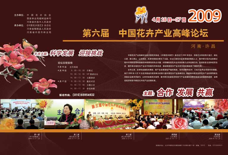 為交流經驗,共謀發展,經研究,定于2009年4月16日—18日在河南省許昌市舉辦第六屆中國花卉產業高峰論壇(以下簡稱“論壇”)。