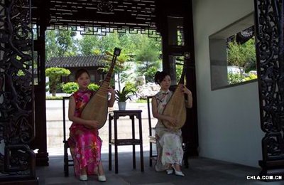 蘇州美女在古吳山莊彈奏的蘇州評彈悠揚悅耳。