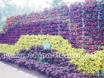 圖為采用節水技術搭建的花墻,可用于壁面綠化,植物材料包括各色彩葉草、四季海棠、矮牽牛等。