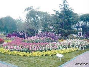圖為廣場軸線景觀,中部是由矮牽牛、百日草、彩葉草組成的花壇;遠處是一組立式花柱,花柱間懸掛雙層花球,花柱由粉色的四季海棠組成,花球由非洲菊、鳳仙、彩葉草構成。