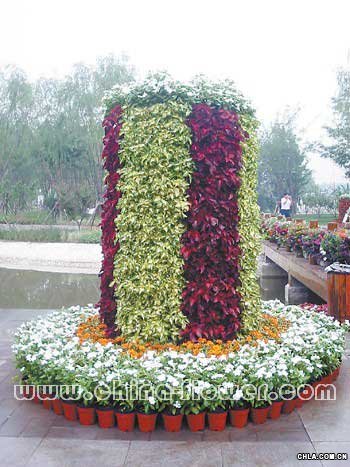 圖在橋頭兩側空地布置柱狀小花壇,柱體由各色彩葉草組合而成,底部用白色長春花和黃色百日草圍合。