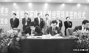 博覽會(huì)期間,在安吉投資環(huán)境推薦暨經(jīng)貿(mào)項(xiàng)目簽約儀式上,香港中小企業(yè)總會(huì)安吉國(guó)際中小企業(yè)工業(yè)園、安吉縣·中國(guó)辦公家具出口基地、中國(guó)白茶城項(xiàng)目負(fù)責(zé)人分別與安吉縣政府有關(guān)領(lǐng)導(dǎo)簽約。