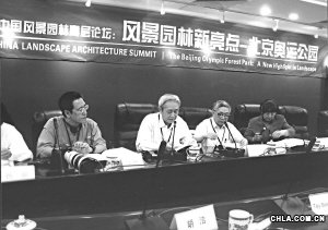 2007年5月14日中國風景園林高層論壇在北京舉行。北京清華城市規劃設計研究院院長尹稚(左一),中國風景園林協會秘書長甘偉林(左二),中國風景園林協會理事長周干峙(右二),國際風景園林師聯合會主席戴安妮·孟賽斯博士(右一)參加了論壇。