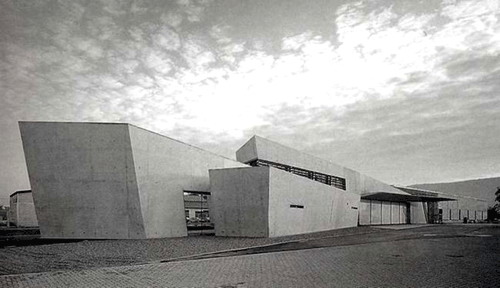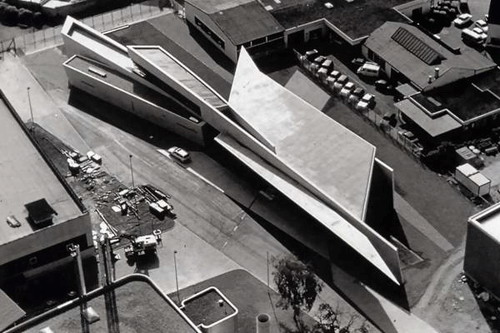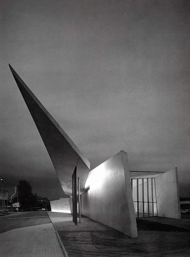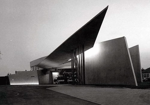 扎哈的作品在具有非凡的創造力和力度之外,也極具女性的想象力。看到扎哈的設計圖,大多數人都會認為那是一種繪畫,那像爆炸一樣抽象的畫面只是畫而已,要實施簡直是天方夜談。(圖9)而在1993年,扎哈有機會完成了她的建筑處女作——德國巴伊爾。阿姆。萊茵的世界家具商維特拉公司的“消防站”的設計。這件很小的作品立刻轟動建筑界,成為當代建筑的經典作。(圖10、11、12)
