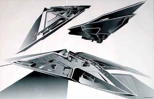 除了很少的幾個實施方案之外,她更多的是末付諸實現的紙上建筑,在那些更為抽象、也更為自由的空間里,她的奇思怪想發揮得更為淋漓盡致。(圖13、14)我曾經看過她的一張設計圖,以黑色為重色的圖中,門和窗似乎都獨立出來了,平面和線條仿佛都在空中飛行。有人這么評價她:“這個黑頭發的伊拉克女人似乎根本不是為地球上的建筑而設計,她的設計思想和建筑精神都沖破了地心吸力而進入了第三維空間”。這和她自己的說法恰巧吻合。她說:過去我認定有無重力的物體存在,而現在我已經可以確信建筑就是無重力的,是可以飄浮的。