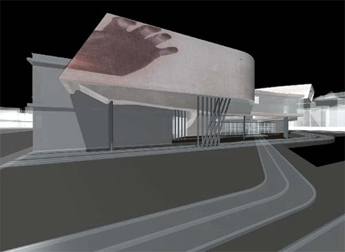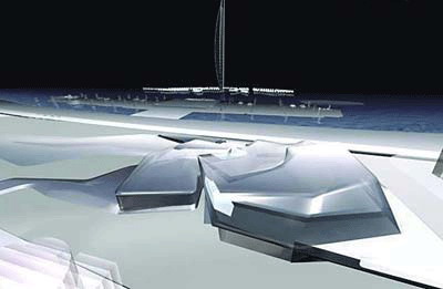 方案中的建筑物面向場地中的大道,進入大門200-300m,就可看到右手邊銳利的刀刃狀的長而薄的房檐,這就是扎哈常常描繪的“建筑的碎片”。沿著路,整個建筑的造型低低長長的延伸下去,卻并不是單一的正方體的延伸,而是3個相似三角形的銳角并排重疊在一起,象一個緩緩下行的樂章,里面充滿了強烈的流動感和速度感。