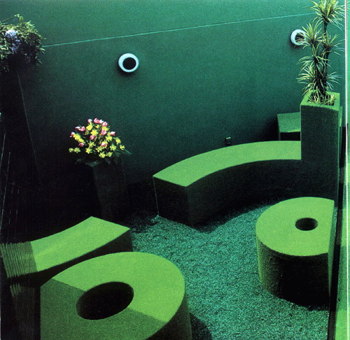 做為一個游離在現代藝術和景觀建筑邊緣的設計師,舒爾茲的設計幾乎每次出臺都引起業界的喧鬧,這一點和扎哈在建筑界的影響有點象。她們一向是那么囂張。她的作品,常常引入陶罐,彩色砂礫,人造皮。塑料植物,輪胎甚至面包圈和糖果等大眾的,世俗的,唾手可得而又轉瞬即逝的材料。表現出對傳統庭園形式與材料的調戲,同時她的園林又是美麗感性的,充滿了眩目艷麗的色彩和幾何圖案,充滿想象力和幽默感,完全體現了女性對生活的熱愛。(圖20)