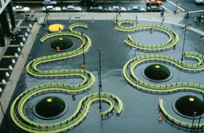 舒爾茲對景觀的色彩運用有獨特的見解,她說:“我們漸漸長大,學會了什么叫有品位,什么是他人能接受的。我們學會了不再為花哨的,鮮艷的,眩目的這些我們小時候偏愛的色彩而激動。我很排斥有關格調問題的所有論點。'品位'是一套支配人們觀看,行動和感覺方式的法則。同樣我們的文化對色彩的看法是病態的。”因此她的作品永遠是鮮艷眩目的,充滿色彩的。(圖24、25)