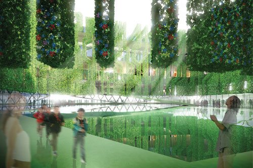 不久的將來(lái),法國(guó)館“感性城市”將以脫離地面的漂浮形式展現(xiàn)在參觀者面前。這棟四方體的白色建筑占地6000平方米,外觀簡(jiǎn)潔明了,整個(gè)建筑被一種新型混凝土材料制成的線網(wǎng)“包裹”,還包括植物綠化墻體、內(nèi)外水池設(shè)計(jì)等。建筑內(nèi)有一個(gè)可容納250人的展示廳和兩個(gè)法式餐廳,在建筑的中心位置是一座法式園林,盡顯水韻之美。