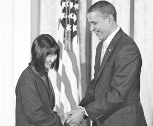 2010年2月25日晚,2009年美國國家藝術獎頒獎典禮在白宮東廳舉行。奧巴馬總統親自為獲得此項殊榮的華裔女建筑師林纓(Maya yingl in)掛上紫色綬帶的金質獎章。