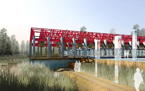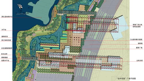 為綜合解決以上六大問題,提出以下六大設計對策: 第一大設計對策:四種文明串寫場地脈絡。方案采用立體分層布局的方式,以后灘地區發展的時間脈絡、空間背景和場地稟賦作為線索,將濕地公園分為濕地生態景觀層、農耕文明景觀層、工業文明遺存層和后工業文明體驗層四個功能層次,由此疊加形成場地的總體功能布局。 第二大設計對策:三帶一區建構濕地基底。方案以“雙灘諧生”為結構特征建立濕地體系,共由濱江蘆荻帶、內河凈化濕地帶、梯地禾田帶和原生濕地保護區四個部分組成。 第三大設計對策:三場九園、步道網絡編織交通體系。方案以一環九縱多路徑的交通路網和三場九園的休憩場所共同形成場地的交通網絡。三場:分別為西端“空中花園”廣場(通過改造利用工業建筑形成),中部水門碼頭廣場,東端漂浮的花園(與會展區相聯系)。九園:在場地中建立多個藝術“容器,”形成多重體驗空間。以網絡的形式構建步道系統,串聯各個體驗空間,形成親切自如的人行交通系統。 第四大設計對策:梯地禾田梳理場地高差。方案利用場地農耕文明景觀層的梯地禾田來消解場地千年一遇防洪標準與內河凈化濕地之間的高差。 第五大設計對策:彈性設計滿足雙重需求。本著節約資源、會后盡量少的改動原則,在設計時充分考慮會后的利用,在功能建筑體和公共服務設施、鋪裝場地等相關方面進行會時與會后的彈性設計。 第六大設計對策:生態理念引領技術航向。生態與人文理念貫穿于后灘濕地公園的全部設計過程,主要體現在再造濕地公園的相關措施與技術方面、場地工業遺存保護再利用等的相關措施與技術,以及其他生態可持續發展等相關措施與技術等。