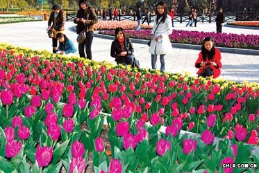 如今的高技術幾乎成了“花神”,可以左右鮮花開放的時間和花期。昨天,記者率先目睹了上海鮮花港的技術人員利用先進技術控制花期手段,使原本只有20天花期的郁金香在未來40天內爭奇斗艷。據介紹,科技人員對郁金香球莖分批進行5℃、9℃等不同溫度的低溫處理,并采取錯層栽培,使花期延長了一倍。從明天起,市民可前往上海鮮花港郁金香花展一飽眼福。上圖:鮮花港百萬株郁金香待客來。