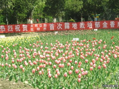 經過兩年的研究和試種,由大同市園林設計研究所露地培育郁金香栽植獲得成功,并首次在大同公園展出。此次培育成功的郁金香共9個品種5000余株。據園藝工人介紹,大同屬于高寒地區,室外栽植該郁金香成活率很低,縱使成活也不開花。此次栽植成功的郁金香花期僅20多天,不日就將凋謝。