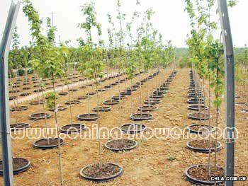 苗木雙容器栽培是指將栽有苗的容器放置于埋在地下的支持容器中。這種集基質栽培、滴灌施肥、覆蓋保護等于一體的現代苗圃生產系統,目前已普遍應用在溫室花卉生產及花卉育苗中。由于根系凍害、熱害及水肥管理等問題,綠化苗木露天容器栽培生產還很少見。山東鴻林園藝公司為提高苗木生產科技含量,近年來積極探索苗木雙容器栽培技術,目前已取得階段性成果。