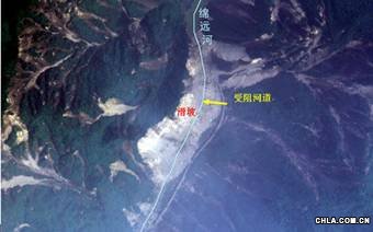 圖3 位于(N31°28′58″,E104°09′02″)的滑坡阻斷河道遙感影像圖