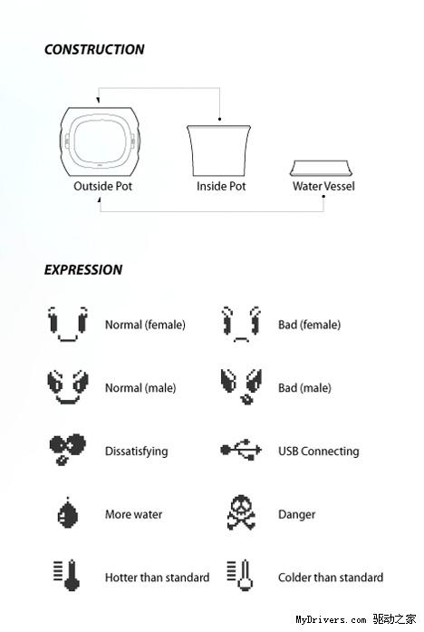 這種寵物植物使用的特制的雙層培養(yǎng)皿(稱為DigitalPot),能夠測量土壤狀況、溫度、濕度和水分,然后根據(jù)植物的需求對這些參數(shù)進行計算,最后通過液晶屏以表情的方式表達出來,比如一切正常、需要澆水、溫度太高/低了、糟糕、危險等等,更有趣的是一些表情還分男女。
