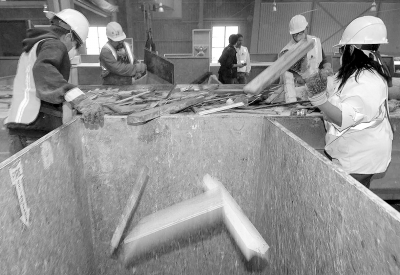 工人在位于美國加利福尼亞州舊金山市的廢物回收處理公司將混雜在建筑垃圾中的料揀選出來。